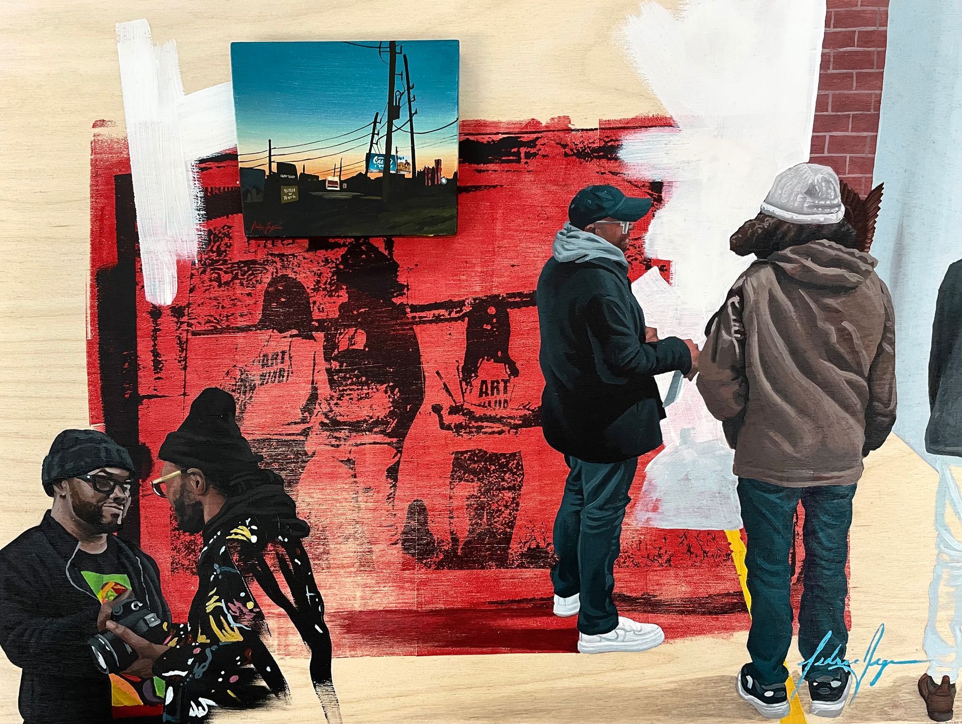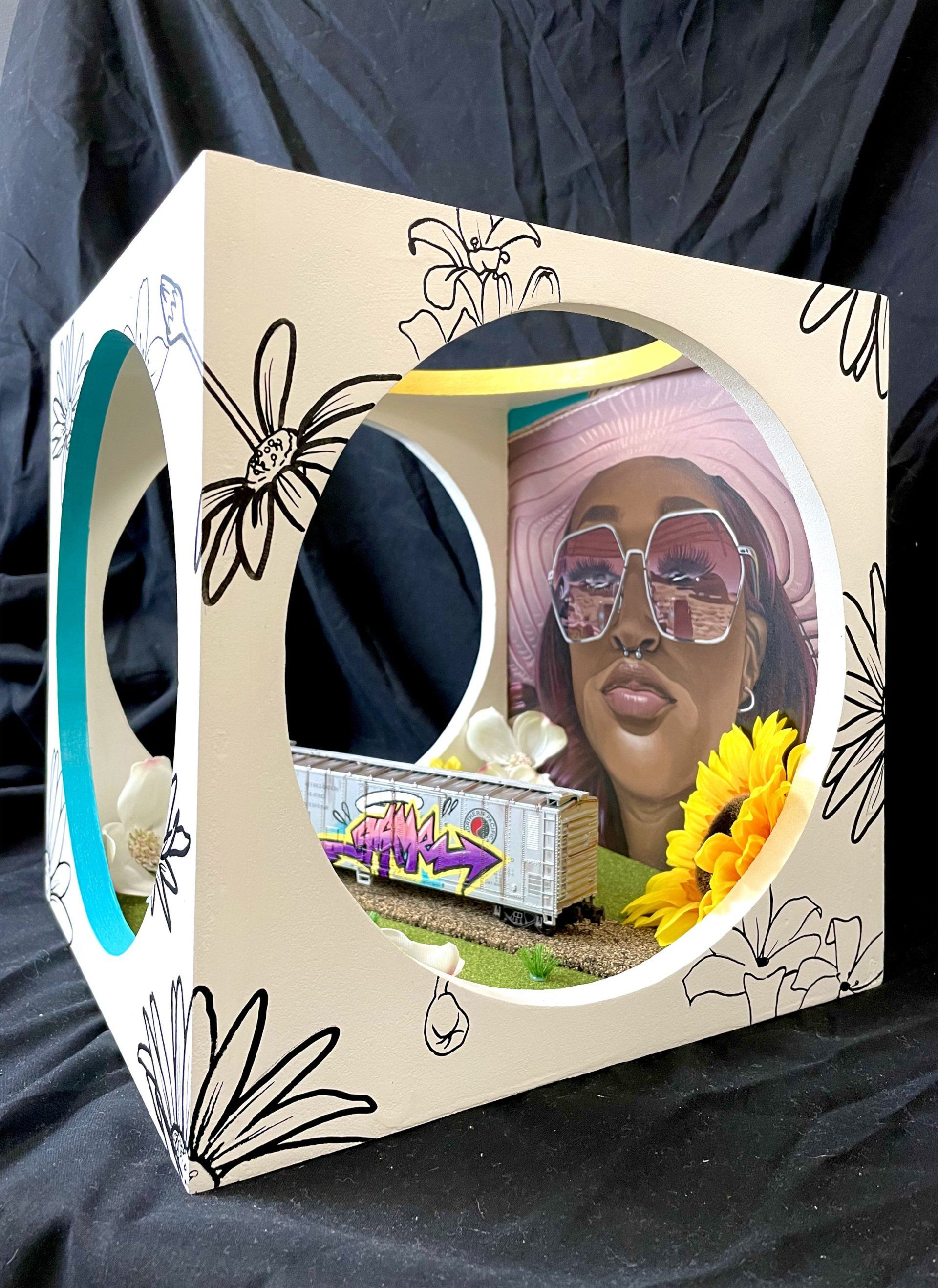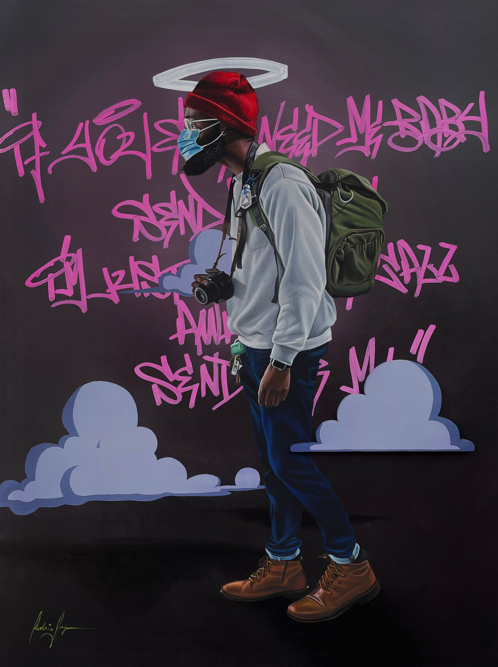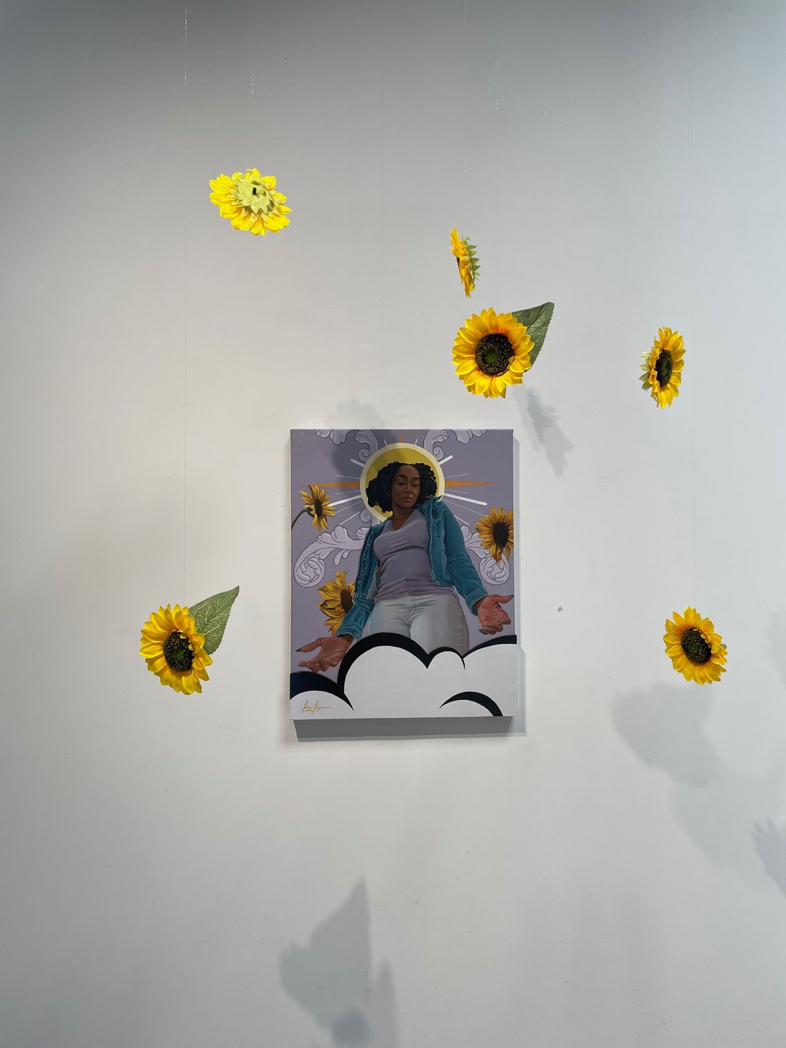 To portray my subject matter in the works of Homecoming, my staple medium is oil pastel. I love the bold vibrant colors it provides and great contrast with the medium. With realism and detail being in my artistic DNA, I also work with acrylics and sometimes couple with oil pastels in the same work. As my art is ever changing, I have come to paint on wood to create a three-dimensional effect with two-dimensional work to continue to blend lines, further engage viewers and not be defined by just one thing. These qualities only mimic how I envision my culture and help to give me a style and voice within my work. This transitional period in my work of 3D in 2D is also a reflection of personal perspectives on topics like religion, cultural economics, self-love, politics and more, which is evident in this exhibition.