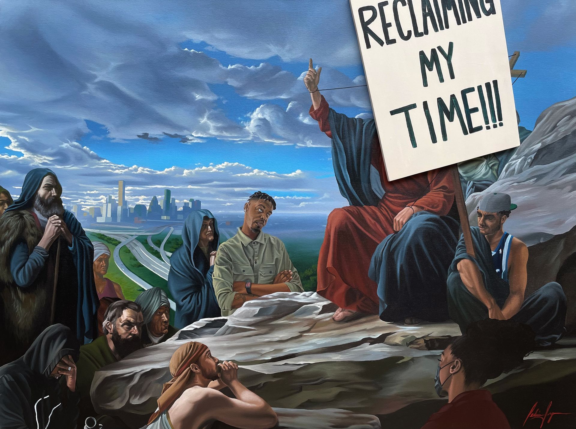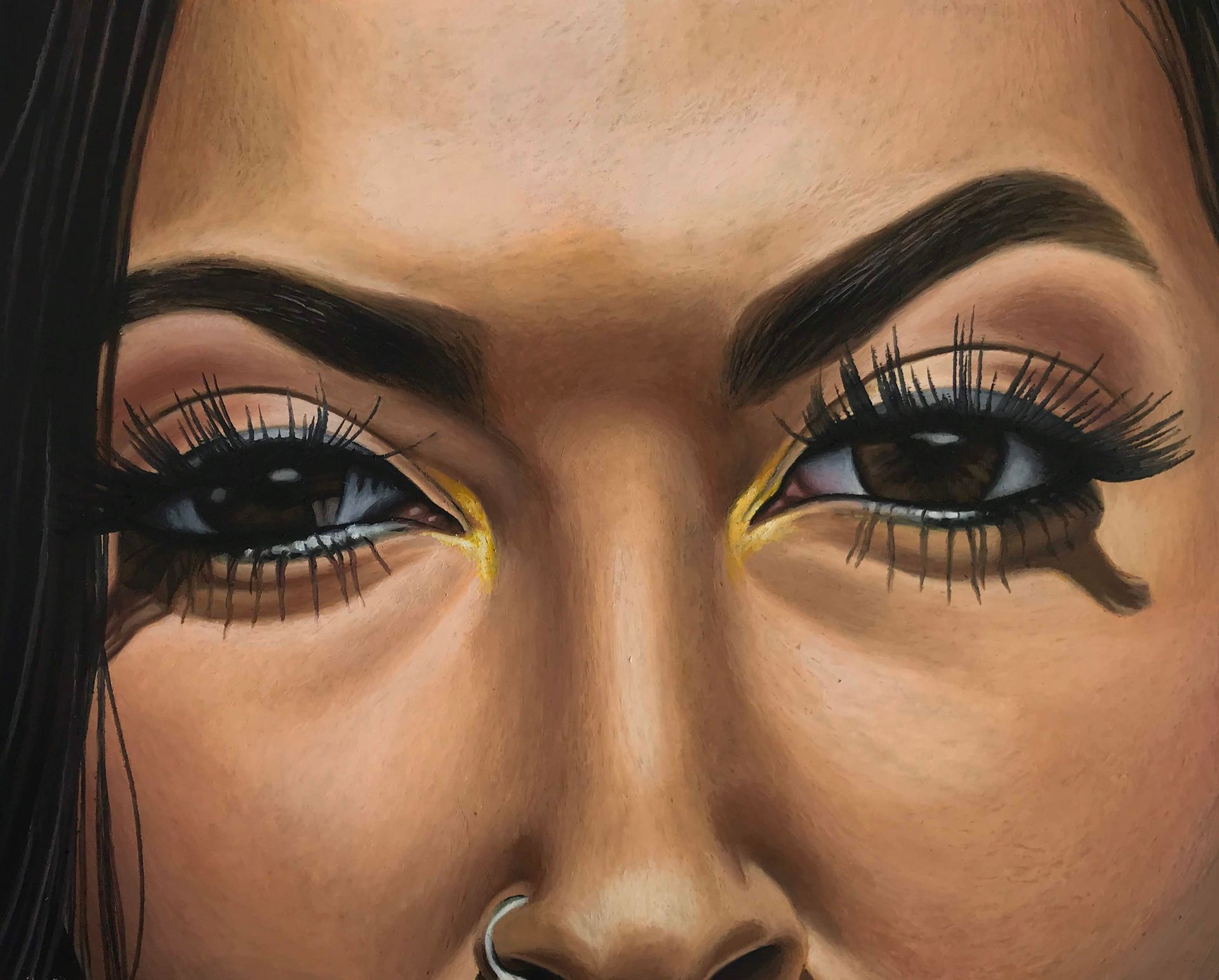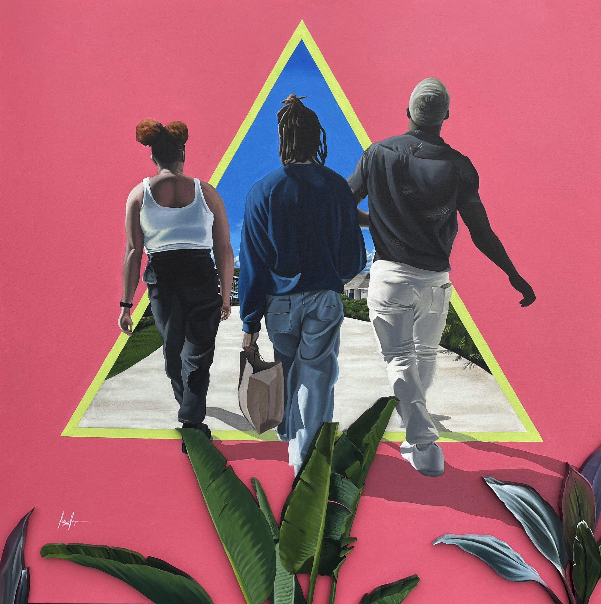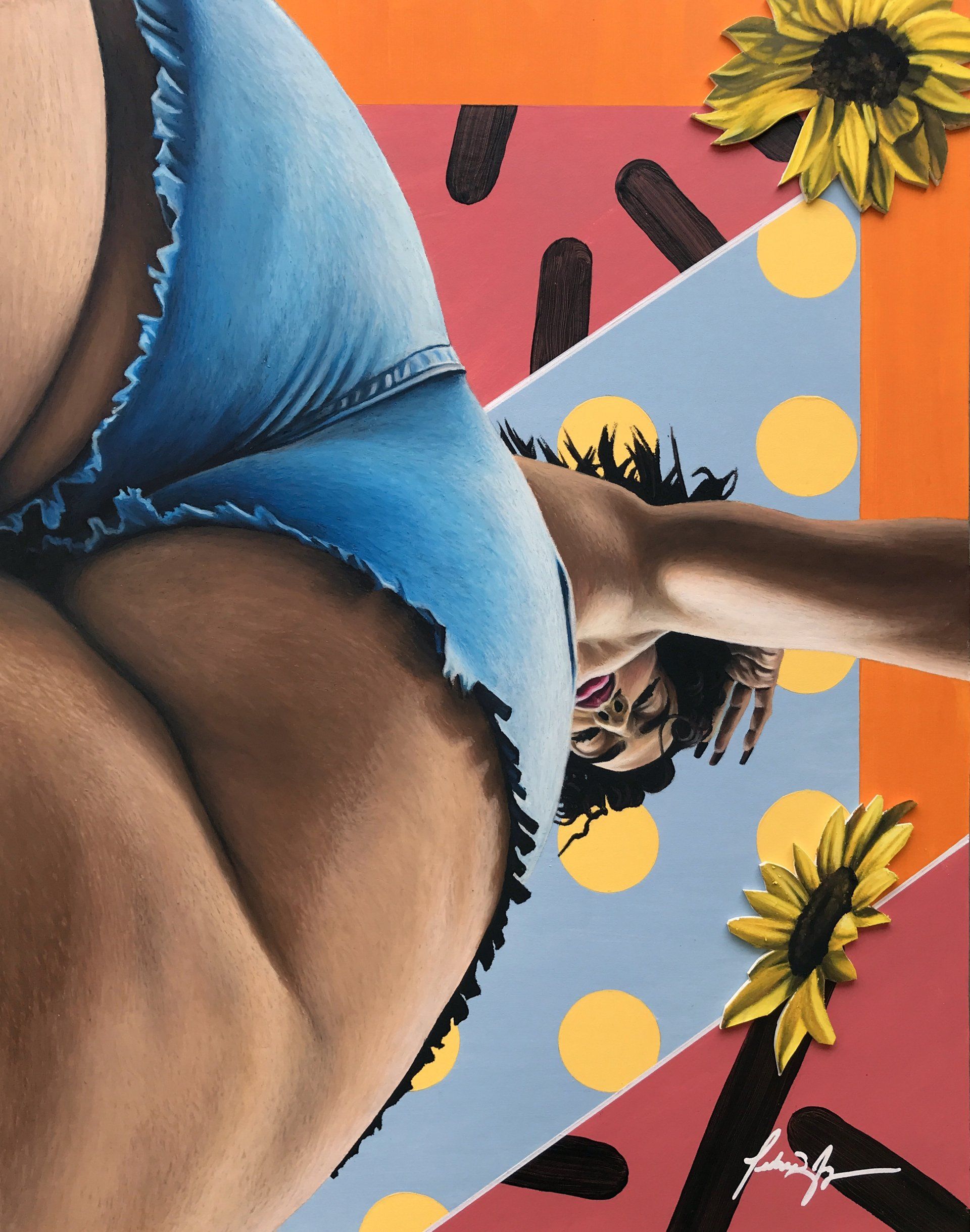 To portray my subject matter in the works of Homecoming, my staple medium is oil pastel. I love the bold vibrant colors it provides and great contrast with the medium. With realism and detail being in my artistic DNA, I also work with acrylics and sometimes couple with oil pastels in the same work. As my art is ever changing, I have come to paint on wood to create a three-dimensional effect with two-dimensional work to continue to blend lines, further engage viewers and not be defined by just one thing. These qualities only mimic how I envision my culture and help to give me a style and voice within my work. This transitional period in my work of 3D in 2D is also a reflection of personal perspectives on topics like religion, cultural economics, self-love, politics and more, which is evident in this exhibition.